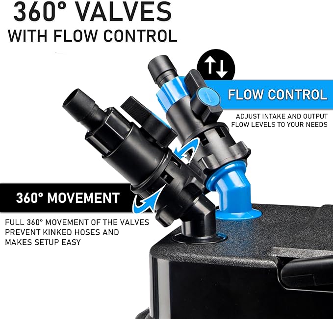 - STATE OF THE ART FEATURES: In addition to the push button primer that allows for a simple and quick prime, this Canister Filter also features two independent valve taps that rotate 360°. This makes for easy maneuvering, even in the tightest aquarium cabinets. The 5 stackable, large capacity media baskets give aquarists the ability to customize filtration.