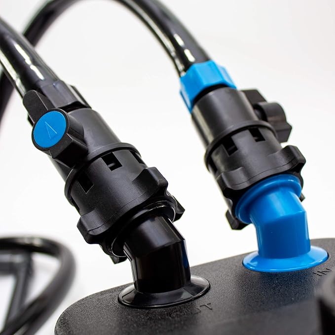 - ITEMS INCLUDED: 2 Independent Valve Taps, Push Button Primer, Flow Rate Control Cut-Off Valves, Swimming-Pool Style Hose Clamps, 4 Easy Lift Alignment Clamps, Sturdy Tip-Proof Base, 5 Large Capacity Media Baskets, 5 Poly Fiber Floss Pads, 1 Coarse Bio-Sponge, and 1 Bag of Activated Carbon.