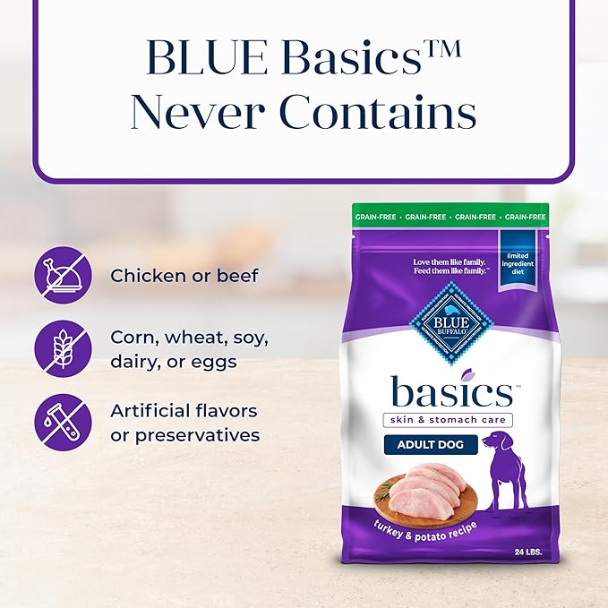 - Contains: One (1) 24-lb. bag of BLUE Basics Grain-Free Adult Dry Dog Food, Limited Ingredient Diet, Turkey, 24 lbs.