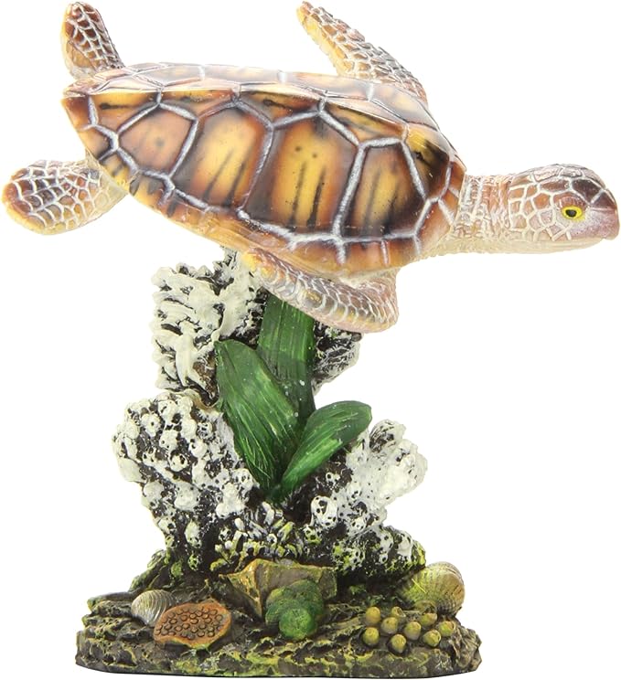 - Realistic Design: Lifelike orange and brown swimming sea turtle decoration adds a natural touch to your aquarium, captivating both kids and adults. Your turtle looks as if he is gliding through your tank, attached to a decorative base of sea plant life and shells to give an authentic ocean floor feeling.