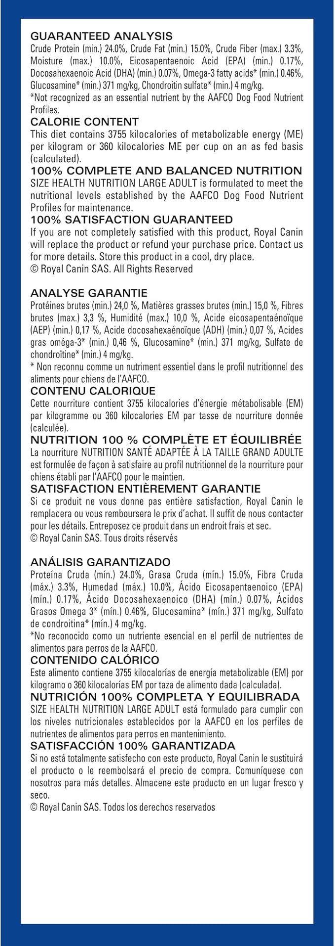 - Royal Canin Large Adult dry dog food (formerly Maxi Adult) is precise nutrition specifically made for large dogs 15 months to 5 years old weighing 56–100 lbs.
