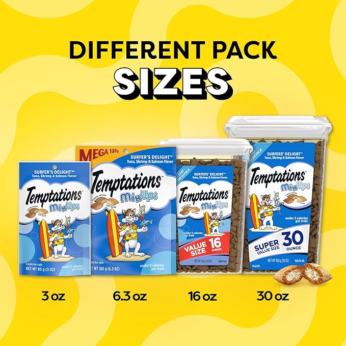 - 16 oz. Tub: Contains one (1) 16 oz. tub of Temptations MixUps Crunchy and Soft Cat Treats Surfer's Delight - Tuna, Shrimp, and Salmon Flavors.