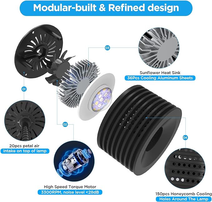 - Efficient Heat Dissipation: Quality aluminum sunflower heatsink and smart silent fan work together to transfer heat and provide an efficient cooling system. This ensures that the coral reef tank is perfectly lit by the saltwater light without overheating