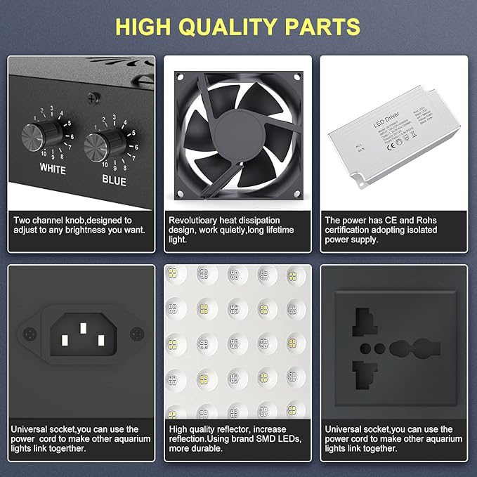 - FULL SPECTRUM- Include UV Blue Purple Red White and Green Light.Blue UV light promotes plants to defense mechanisms.Purple light can be used to sterilize and protect fish growth. White and red Light is essential for coral reef growth. All these lights are properly matched to make your aquarium healthy and beautiful.