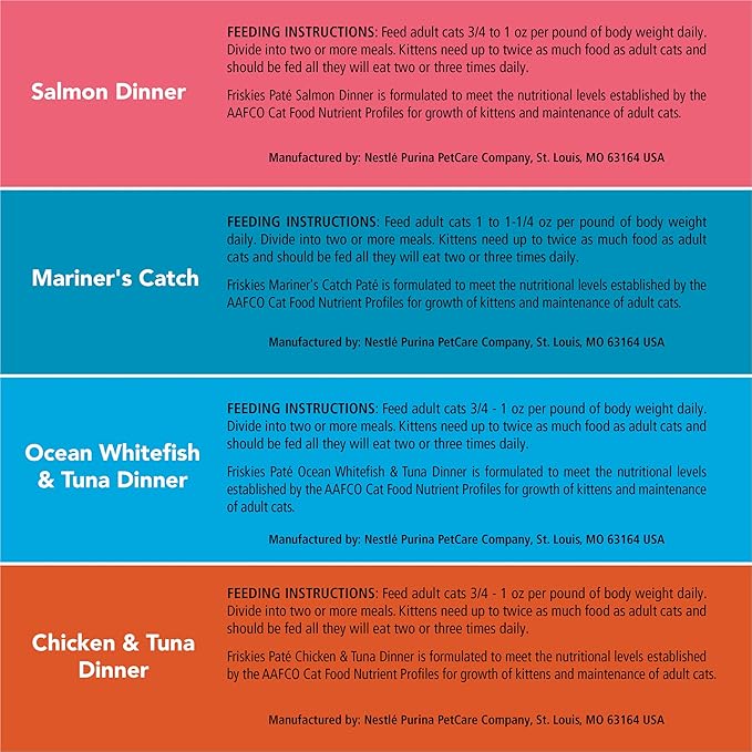 - Friskies canned cat food pate variety pack checked for quality and safety to provide added peace of mind and formulated to meet or exceed industry standards for cat food