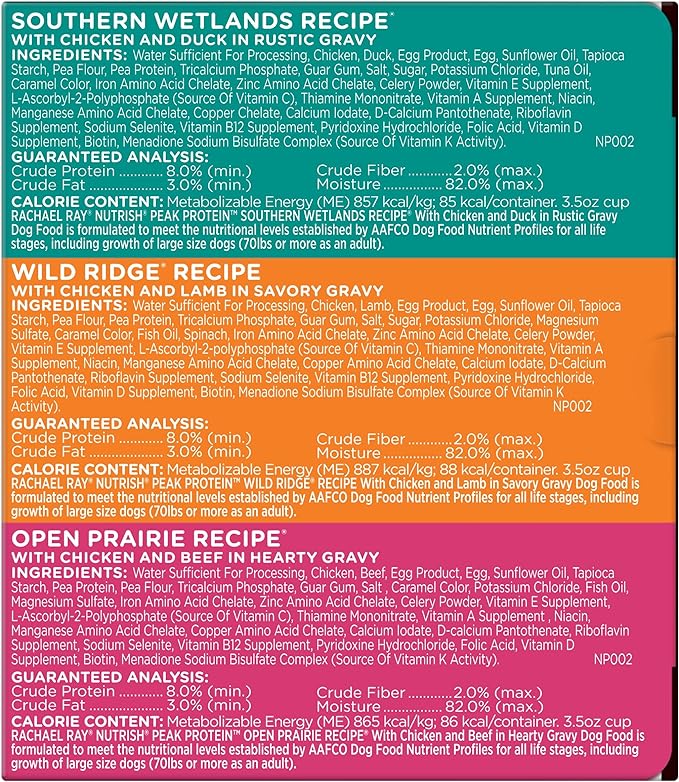- Contains three (3) cups each of three (3) Rachael Ray Nutrish Peak Protein wet dog food recipes (9 count total)