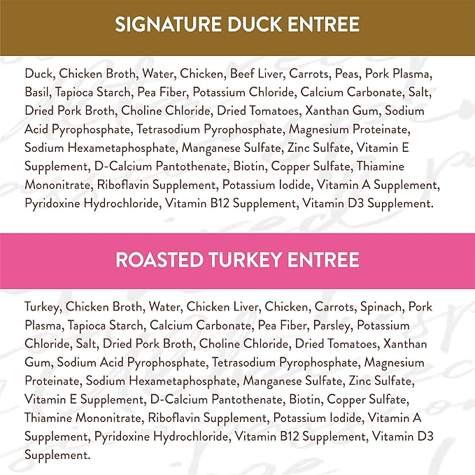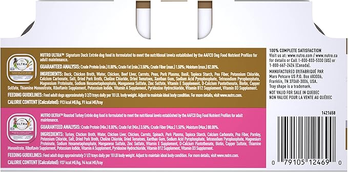 - Contains twelve (12) 3.5 oz. trays of NUTRO ULTRA Grain Free Adult Wet Dog Food Filets in Gravy Variety Pack: (6) Signature Duck Entrée With Spring Vegetables and a Hint of Basil and (6) Roasted Turkey Entrée With a Mix of Carrots and Spinach