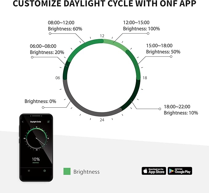 - App Control, Customization Made Easy>>The free ONF Link app uses your phone (available for iOS and Android) to manage your ONF devices, including Daylight Cycle, brightness and color temperature, and keeps up to 5 groups of settings. The built-in IC retains the setting even when turned off, never losing track. (Check the video for illustration)