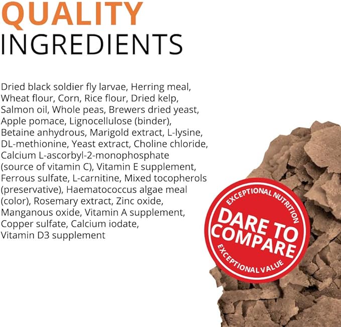- Goldfish food that contains up to 40%, nutrient-rich Black Soldier Fly Larvae, the first ingredient