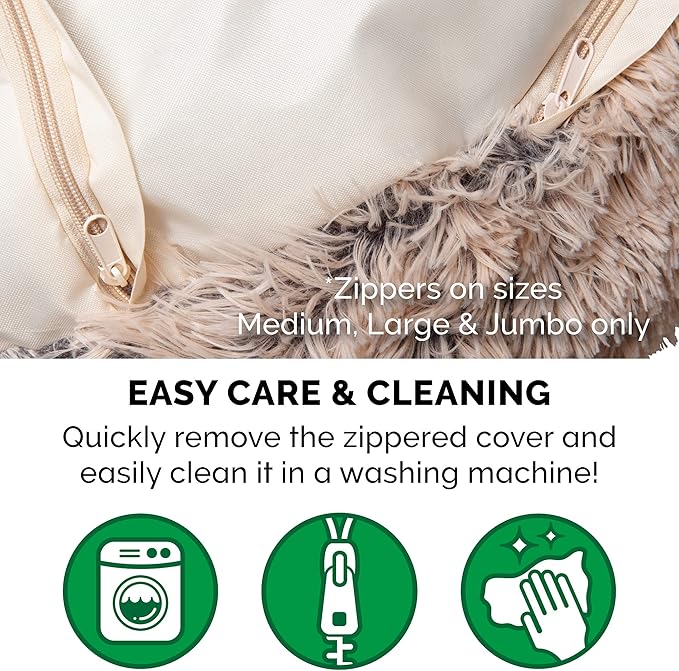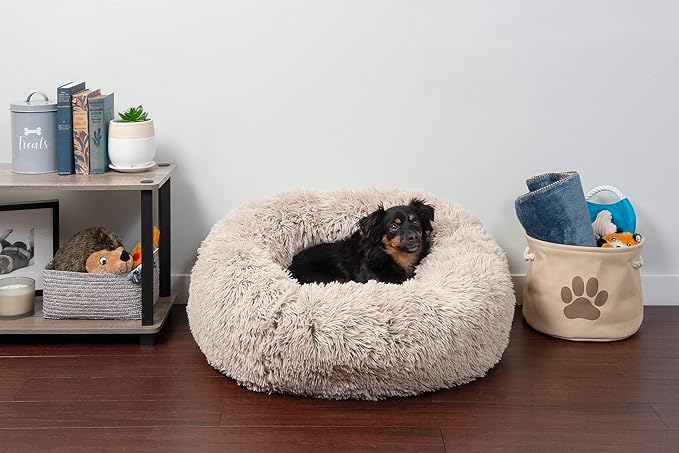 Furhaven 30" Round Calming Donut Dog Bed for Medium/Small Dogs, Refillable w/ Removable Washable Cover, For Dogs Up to 45 lbs - Shaggy Plush Long Faux Fur Donut Bed - Taupe, Medium