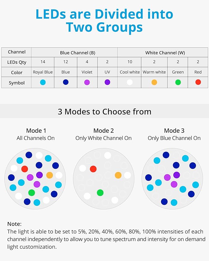 - With touch control, white and blue channels can be operated together or independently, allowing you to adjust the light intensity and spectrum for your tank