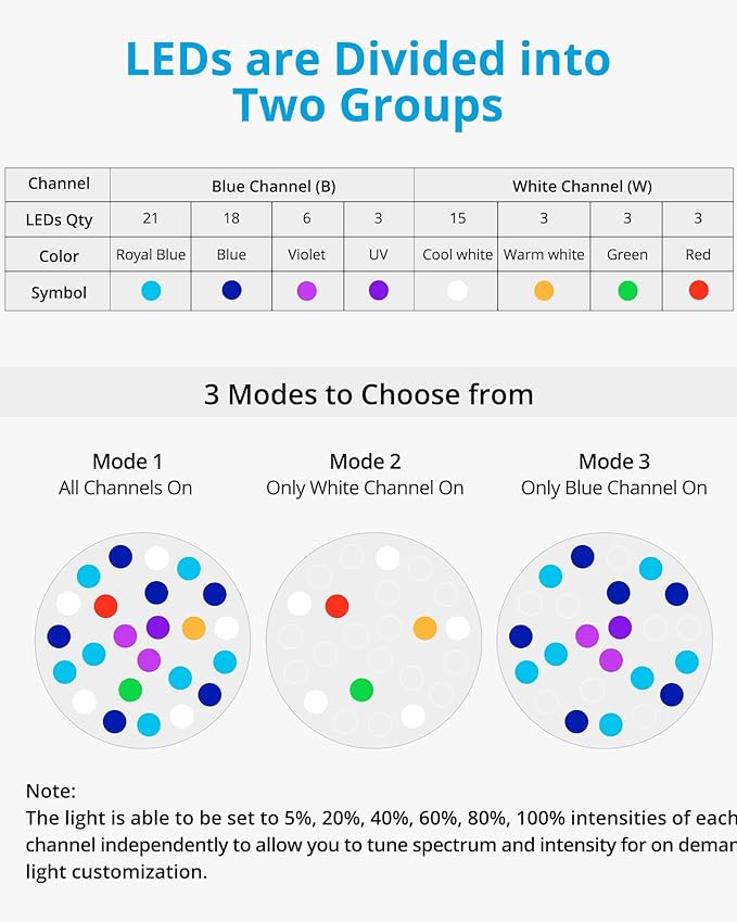 - With touch control, white and blue channels can be operated together or independently, allowing you to adjust the light intensity and spectrum for your tank