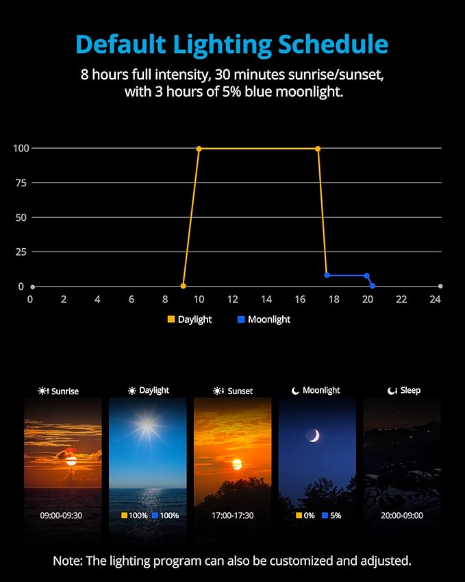 - NATURE-CENTERED DESIGN: More options to adjust the auto On/Off time and brightness. Featured 6 ramp-up and dim-down options to simulate natural sunrise and sunset (0, 15, 30, 60, 90 or 120-minute), waking the fish up in soft lighting and ensuring a good sleep with complete off at night
