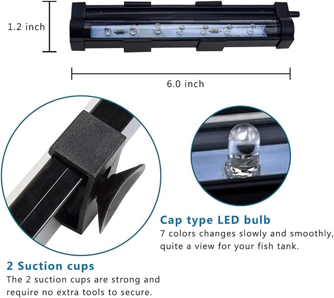 - 【Energy saving】: Use 7 cap type LED bulb,with only 1 watt power consumption, saving up 90% energy than a regular LED light, 7 colors changes slowly and smoothly, quite a view for your fish tank.