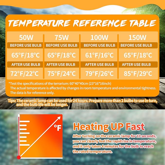 - 🦎Heating UP Fast - After turning on the reptile ceramic heat bulb for 10 seconds, you can clearly feel the rapid rise in temperature, and it only takes 4 minutes for the reptile heat lamp to reach the rated temperature.