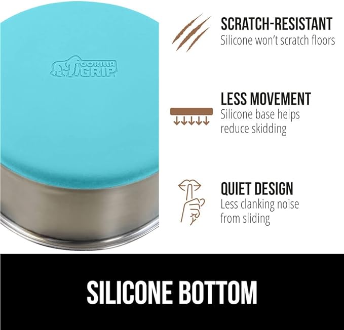 - SILICONE BOTTOM: the Gorilla Grip bowl is constructed from durable silicone that helps keep the bowl steady and won’t scratch your floors; while some over eager eaters may still be able to slide the bowls, the silicone will help prevent much movement; plus, it reduces the noise from clanking and sliding across wood, tile, and more