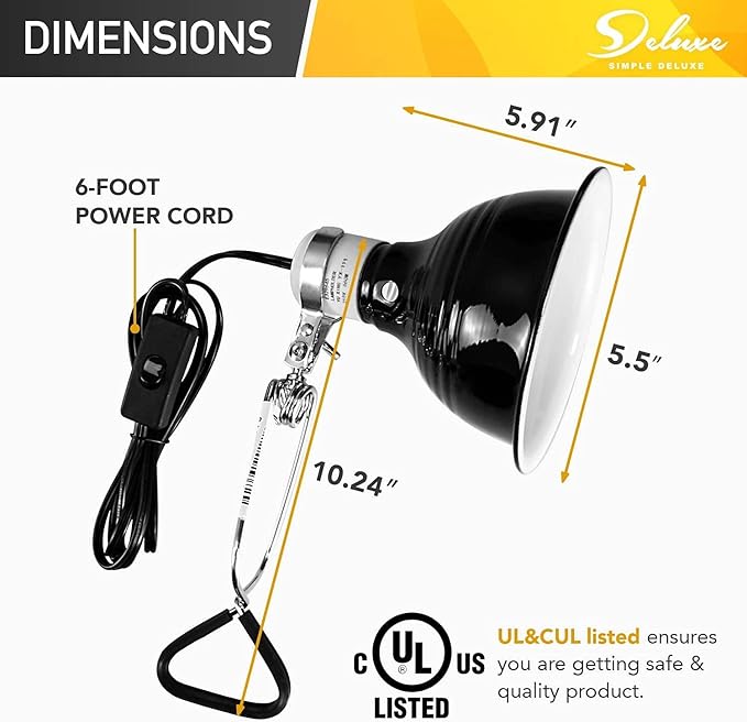 - Package Include: 1-pack 50W ceramic heat bulb, 1-pack 60W clamp light with 5.5 inch reflector, 1-pack 40℉-108℉digital thermostat controller