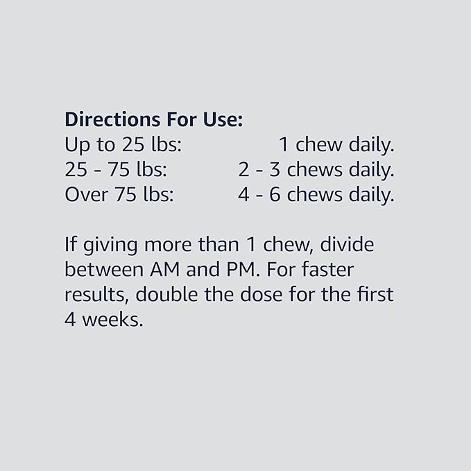 - Direction for use: 1 chew per day for dogs up to 25 lbs, 2-3 chews per day for dogs 25-75 lbs, 4-6 chews per day for dogs over 75 lbs