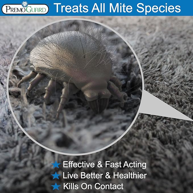 Mite Killer Spray by Premo Guard – 32 oz – Treatment for Dust Spider Bird Rat Mouse Carpet and Scabies Mites – Fast Acting 100% Effective – Child & Pet Safe – Best Natural Extended Protection