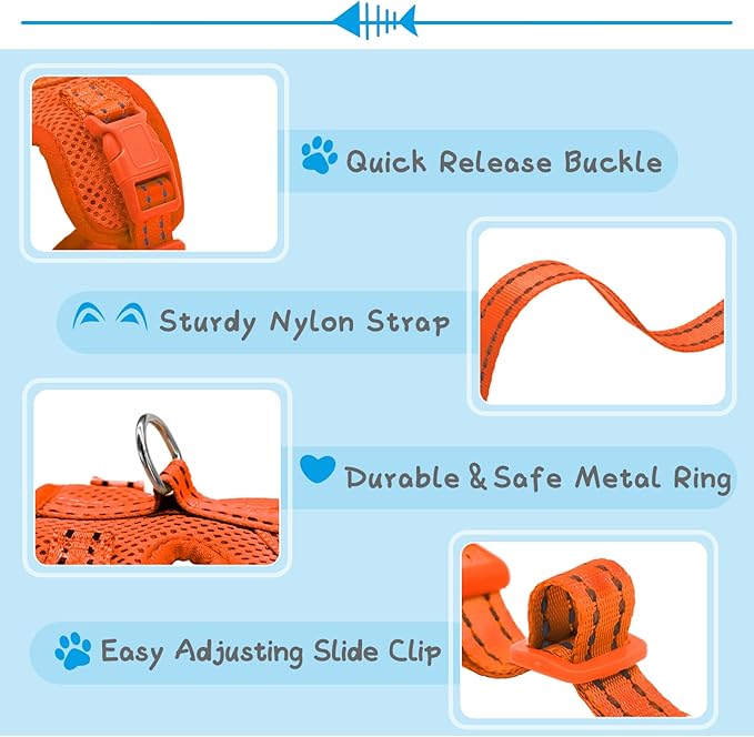 - 【Soft & Comfortable Design】This Small Animal Leash is made of lightweight, soft, breathable air-mesh fabric, with soft edge and resilient cushioning, which can effectively prevent injuries, giving extra comfort and protection, this all weather pet vest won't be too bulky to restrain your pet's movement or overheat your lovely pet when hot, and reinforced stitching allows you to walk your pet with confidence.
