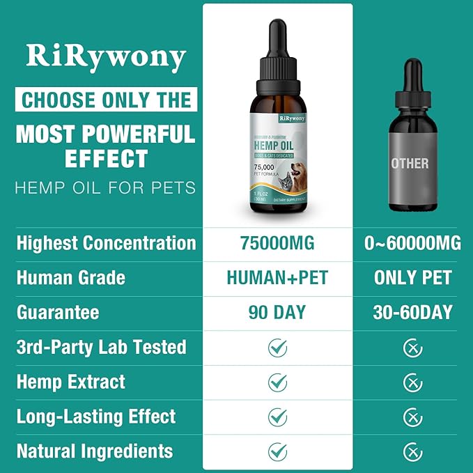 - SAFE AND RELIABLE BRAND: RiRywony uses human food-grade and GMP certification factory to produce pet hemp oil. Promised every link is strictly inspected and tested. Non-GMO, NO Corn, NO Dairy, Gluten-free. Because pet is our human kindness partner