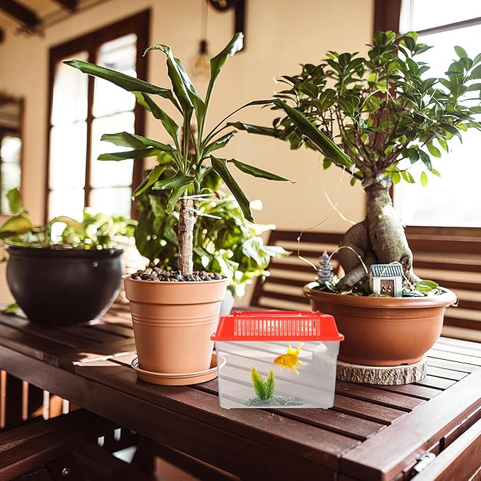 Baluue Portable Fish Tank, Handheld Fish Tank, Plastic Mini Fish Box, Transparent Cutout Design, Plastic Aquarium with Handle for Turtle and Pet Fish ((Red- Lid for Random))