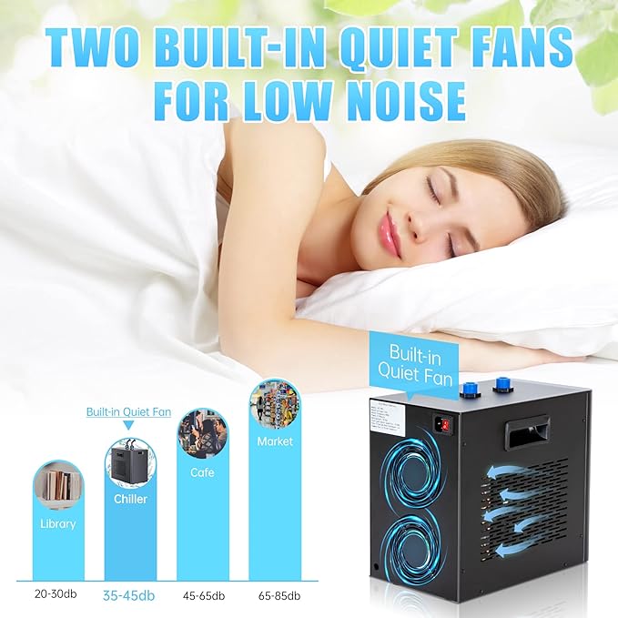 - 【Well Heat Dissipation】Equipped with two built-in quiet fans & multiple holes, ensures excellent heat dissipation efficiency, even if the machine works all the time, no problem at all. NOTE: Please place the chiller in a well-ventilated environment (with at least 6 inches of surrounding space) to ensure better heat dissipation and cooling.