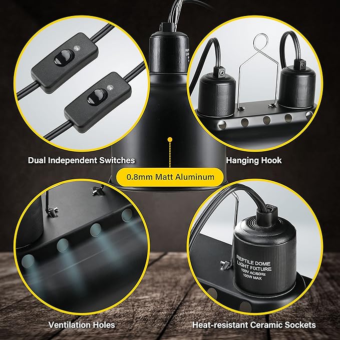 - Dual Lamp Fixture: Holding two bulbs in one stand easily, you can assign any two of reptile lamps (heat lamp, UVB lamp, basking lamp, daylight lamp, and nightlight lamp) together in one fixture as your request