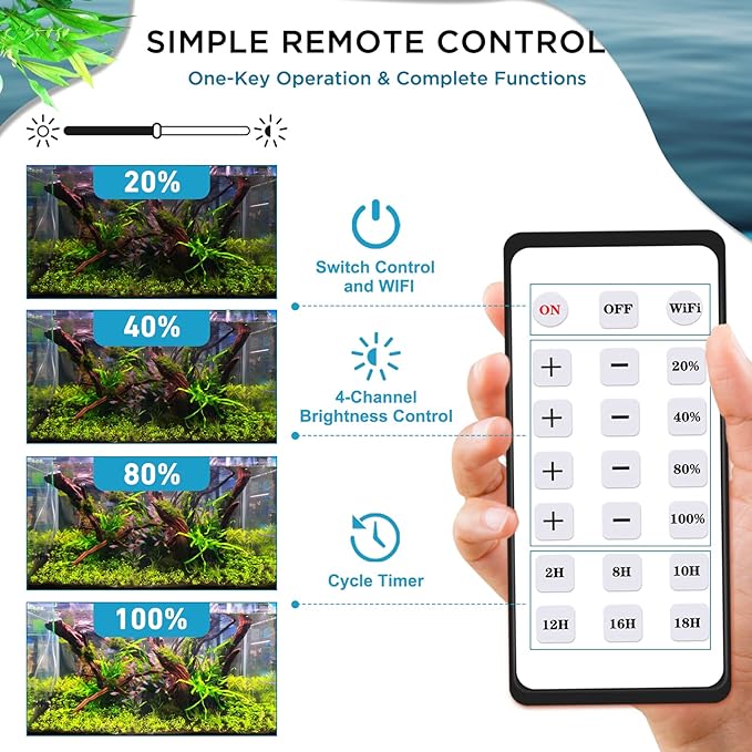- Adjustment System: The planted aquarium light can be adjusted in three ways with Remote, Dimmer, Smart Controller with timer and dimmer setup; the LEDs are distributed in 4 separate channels, you can adjust the colors and brightness to your likings