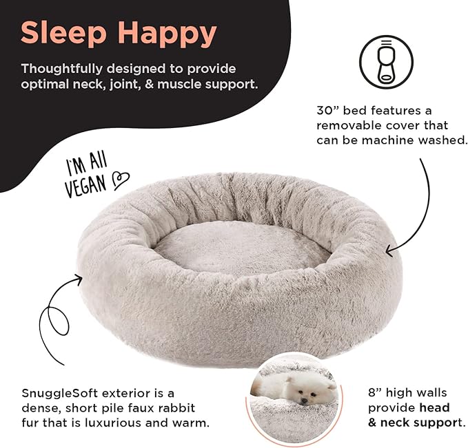 - MAINTENANCE & DESIGN IN MIND: Available in beautiful two-tone colorways, our cat and dog donut cuddler beds are a seamless addition to any room’s décor! Upscale rabbit fur adds a luxurious aesthetic. Finished with water and dirt-resistant bottoms, accidental messes will be prevented from reaching your floors.