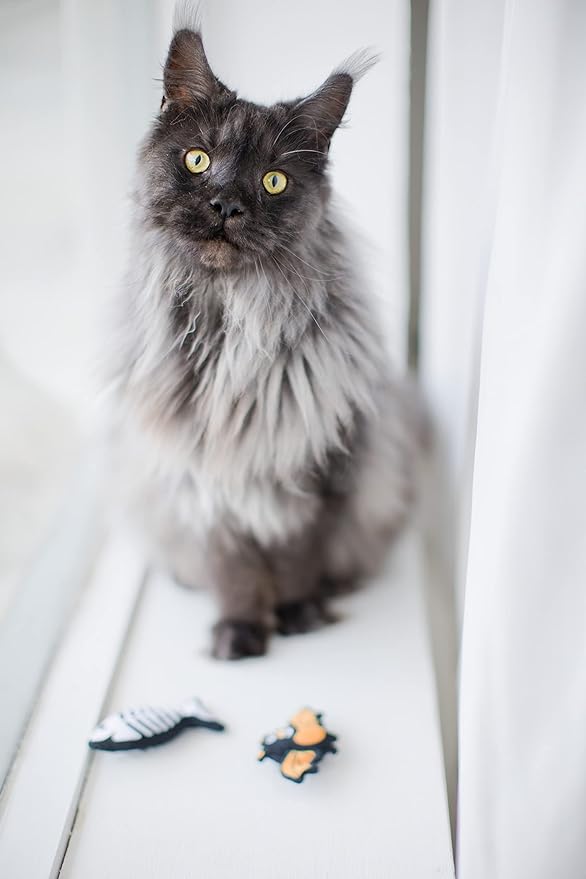 - Includes two plush cat toys: one crinkle fish skeleton and one rattle bat – each with their own cat nip pouch