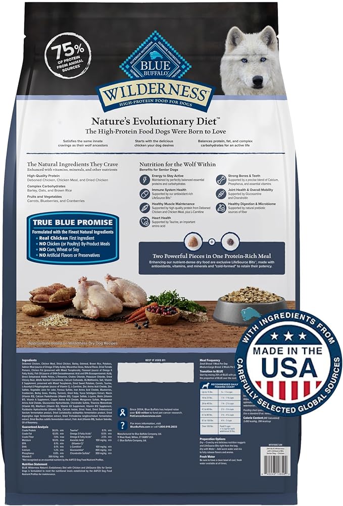 - Contains: One (1) 24-lb. bag of BLUE Wilderness High-Protein Senior Natural Dry Dog Food, Chicken Recipe