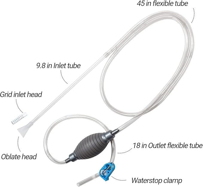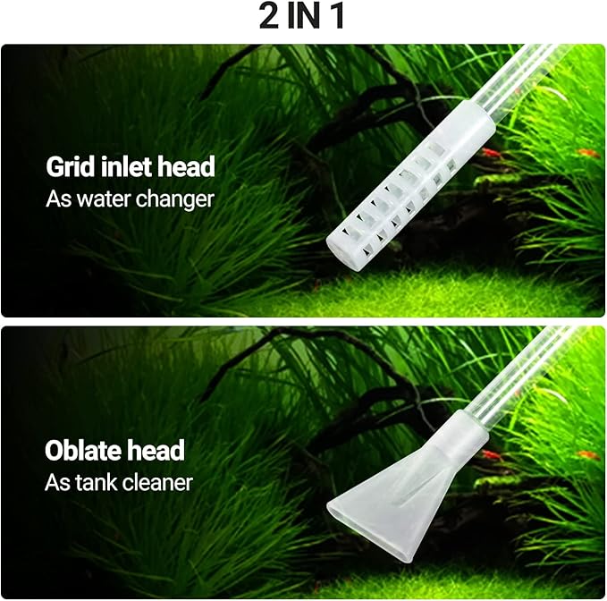 - 【2 IN 1 Multifunctional Siphon Gravel Cleaner Set】: It can work as water changer or tank cleaner as it has grid inlet head and oblate head, you can install the head as you need. Whether you have a small or extra-large tank, this flexible terrarium cleaning kit works well with all types of terrarium, the tube is long enough(79inch) and flexible, convenient to use.