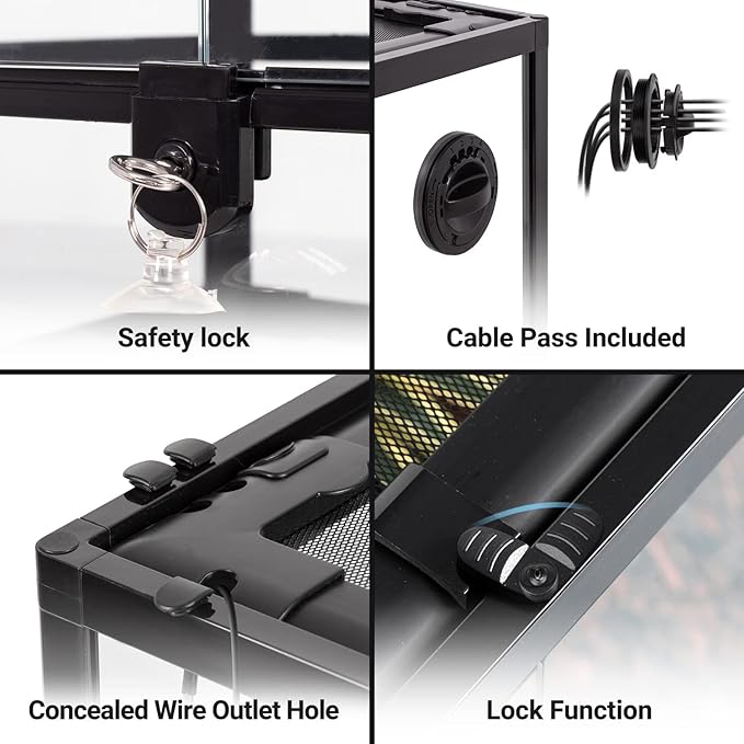 - 【Well Ventilation】Removable screen top provides ventilation and allows UVB and infrared penetration. The sturdy metal top cover of this rainforest tank can place reptile heat lamp, UVB light and other accessories. The full glass reptile terrarium will provide your pet a warm house!