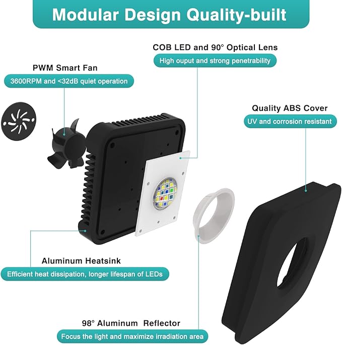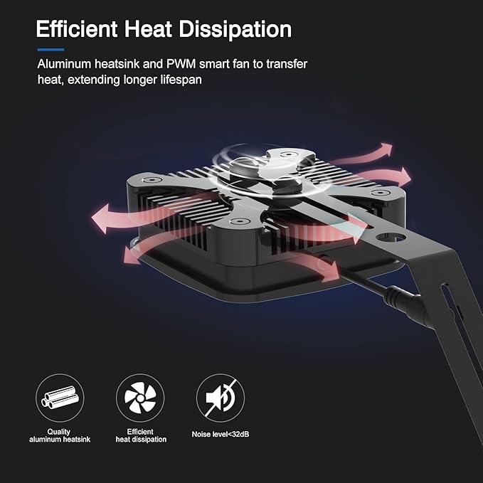 - Effective cooling Low Noise: This freshwater aquarium light uses quality aluminum heatsink and PWM smart fan to transfer heat, operation temperature is lower than 38 ℃, Fan noise is 32 dB, you can rest assured to put this nano planted tank light in bedroom
