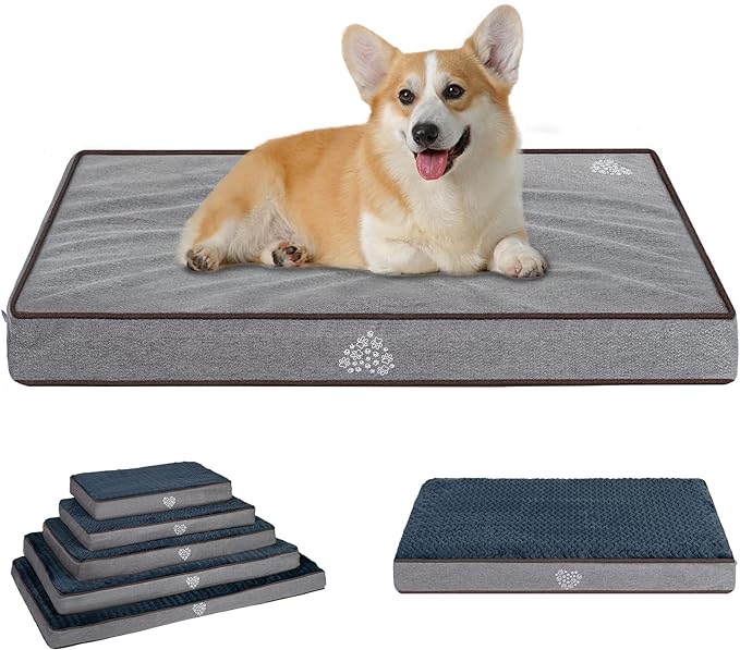 VANKEAN Dog Bed Soft Crate Pad Mat Reversible Cool & Warm, Washable Comfy Kennel Pad with Orthopedic Egg-Crate Foam for Small Medium Large Dogs, Water-Resistant Pet Bed, Gray/Dark Blue