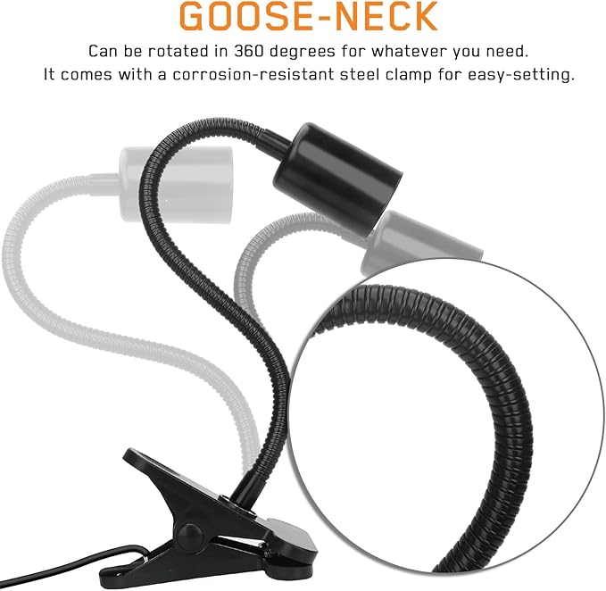 - - Flexible Designed:Extramely flexible 11-inch goose-neck can be rotated in 360 degrees, and securely clipped onto a terrarium.