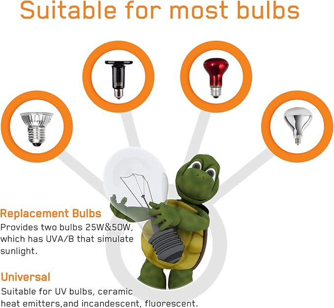 - - Replacement Bulbs:Provides two E27 bulbs 25W&50W,which has UVA/B that simulate sunlight. The ceramic socket which can withstand constant high heat. Suitable for incandescent, fluorescent, UV bulbs, and ceramic heat emitters.