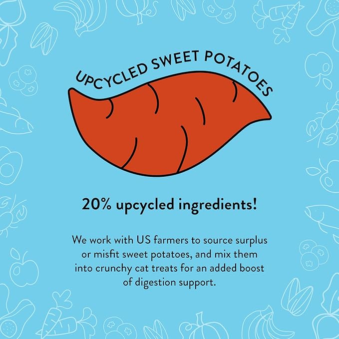 - Cat Treats for Skin & Coat Support: Your cat's skin & coat routine just upped its game. With a few of these delicious crunchy, star-shaped bites, they'll be doing the cat walk with perfection, from head to toe. Made with upcycled sweet potatoes, with added fish oils for that extra skin & coat support, your cat will be lookin' good and feelin' good. Includes one 2.5 oz bag.