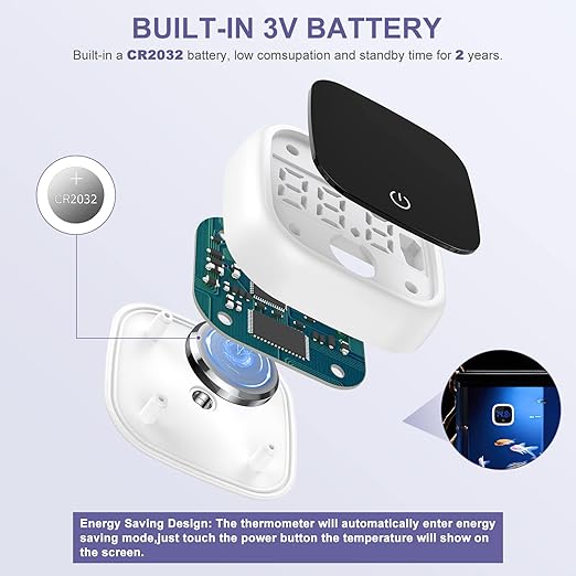 - 【Touch Button】Touch button to display the temperature, the thermometer outside the fish tank will go to sleep after 5s, more energy saving and environmental protection; Environmentally friendly stick-on sensor thermometer, cordless design, no messy probes and wires in the water, providing a clean and safe environment for the creatures in the water, built-in battery, please do not put the thermometer into the water.