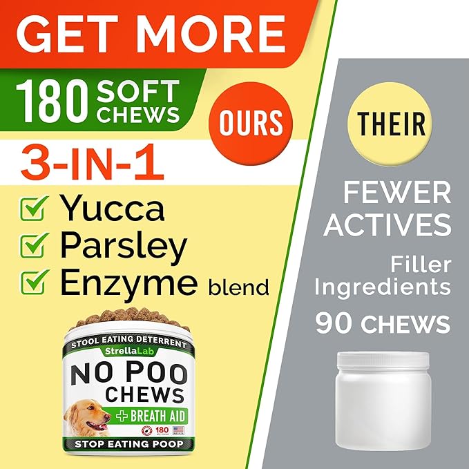 STRELLALAB No Poo Treats for Dogs - Coprophagia Stool Eating Deterrent - No Poop Eating for Dogs - Digestive Enzymes - Gut Health & Immune Support - Stop Eating Poop - Chicken Liver Flavor 180 Chews
