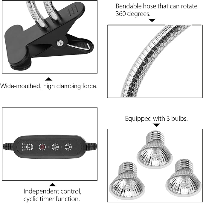 - Separate Control: Our Dual-Head reptile heat lamp features separate control options, allowing you to adjust the heat and light settings independently.