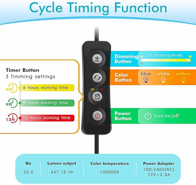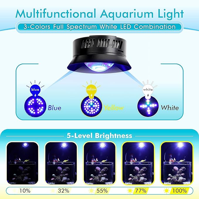 - Multifunctional: 5-level brightness adjustment: 100% --77% --55% --32% --10%, easily dimmed appropriately for different marine pets (coral reefs or fish) lighting to promote the growth of any SPS and LPS that under it; 3 light colors: blue, warm white, white; 3 timing options: the internal timer allows you to choose the light running for 6H, 9H or 12H; Switch: press the key to turn on or off the light, the operation is very convenient