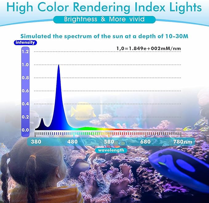 - Full Spectrum Reef Light: Proven full spectrum light (including U-V, purple, blue, red, white and green light). Blue light promotes the production of vitamin D3, which helps corals absorb calcium and make them show more vivid colors; U-V light can promote plant defense mechanisms; purple light be used to protect fish growth; white light and red light help your corals grow faster. It provides evenly distributed lighting and full spectrum, producing stunning lighting effects for marine aquariums.