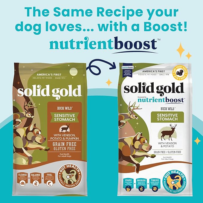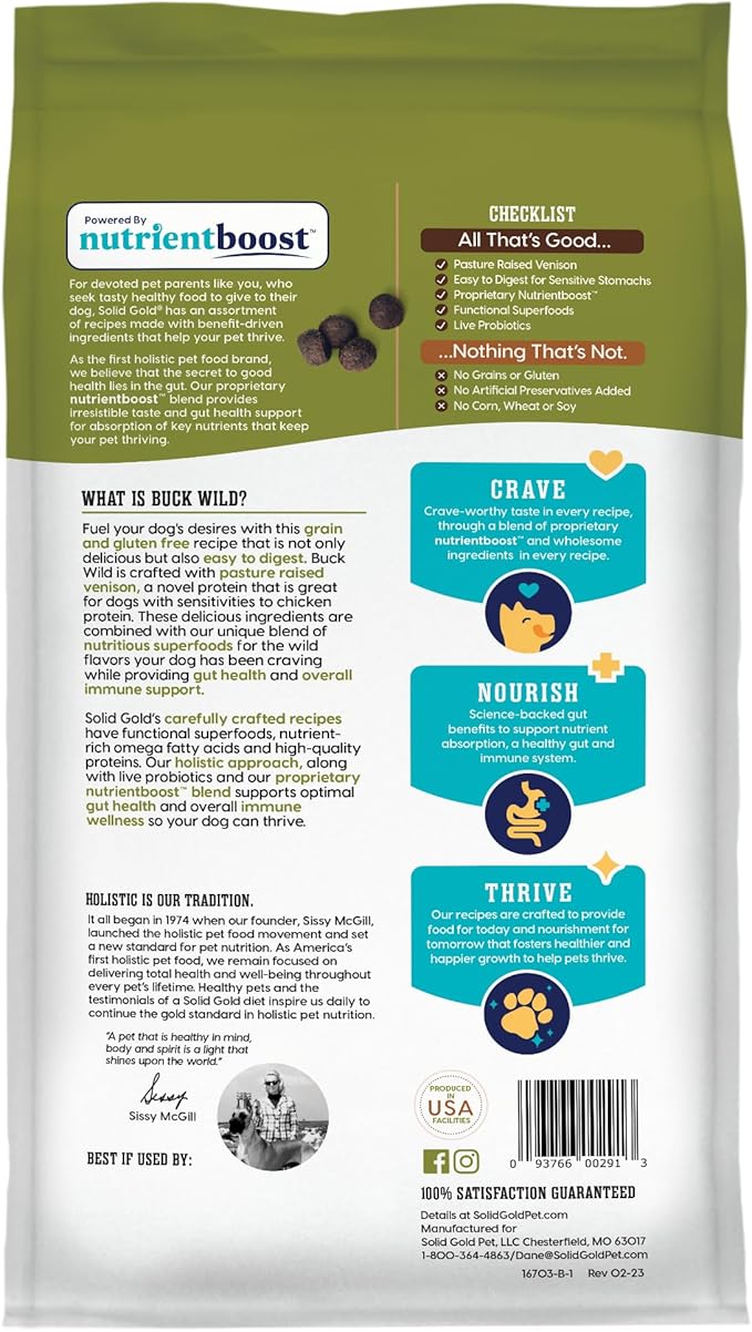 - Yummy Food that Dogs Go "Wild" For! - Solid Gold nutrientboost Buck Wild is a dry dog food with real pasture raised venison, potato, and pumpkin that is easy on the stomach and great for the gut.