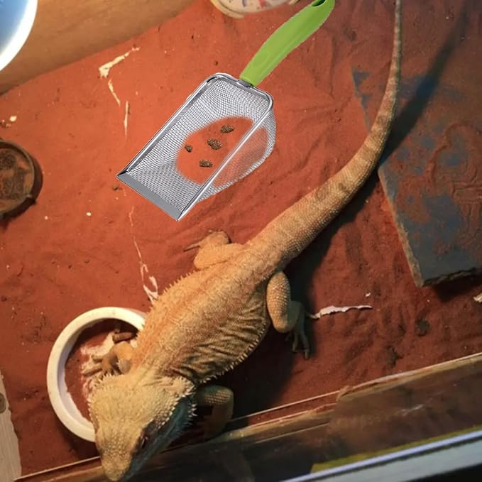 Reptile Sand Substrate Scoop Reptile Sand Fine Mesh Reptile Scooper Stainless Steel Terrarium Substrate Sand Bedding Litter Cleaner Scoop and Reptile Long Feeding Tongs Set (Green-2mm)