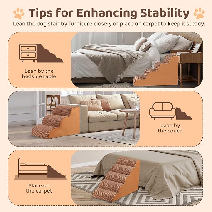 - šSupportive & Steady: These pet stairs for large dogs adopt with 30D high-density pure foam, featuring supportive and lightweight. Generally, it can provide stable support for small/medium-sized dogs and other pets under 45 lbs. The non-slip corduroy pet stair cover increases extra grip while in use. The bottom features non-slip rubber dots, preventing pets from sliding while climbing up and down.
