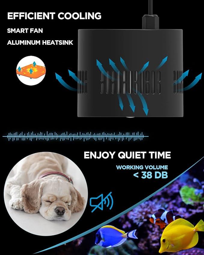 - Efficient Heat Dissipation: Quality aluminum heatsink and smart fan to transfer heat and cool the LED board, fan’s noise level is lower than 38db, silent operation, the clip on aquarium light will perfectly light up your 24" croal fish tank