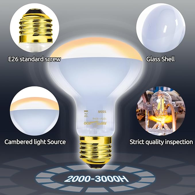 - 【Effective Output】This heat lamp has reflector design, enhance the spectral output and increase the body color deposition of reptiles, while achieving rapid heating. Cambered light source that the light is not harsh, suitable for animals sensitive to bright light. Lifespan up to 2000~3000 hours.