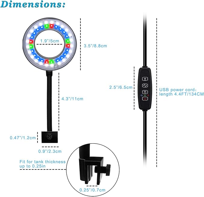 - 【Aquarium Light with 3 / 9 / 12 Hour Timer】 Which is designed to clip on 1 to 3 Gallon aquariums, you can adjust the shutdown time, the color and the brightness separately to suit your needs. DC powered, it can be used to any adapter with USB interface. ( Adapter NOT Included )